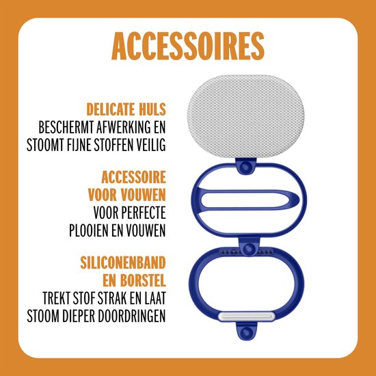 | Meegeleverde accessoires | Kledinghaak, Opzetborstel, Delicate stoffenhoes, Creaser, Siliconen band |